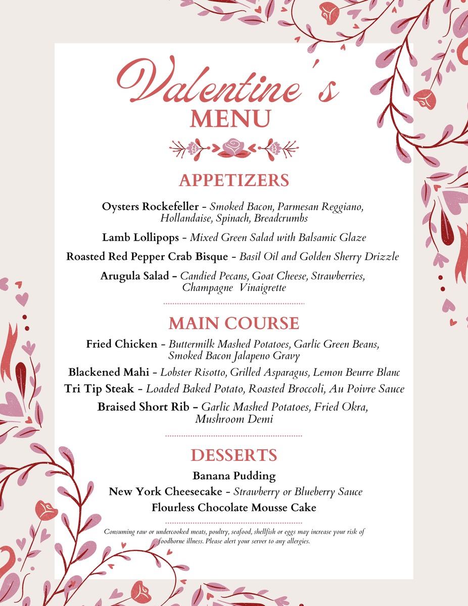 Friday, 2/13 - A la carte menu available. Enjoy your favorites with a romantic touch.