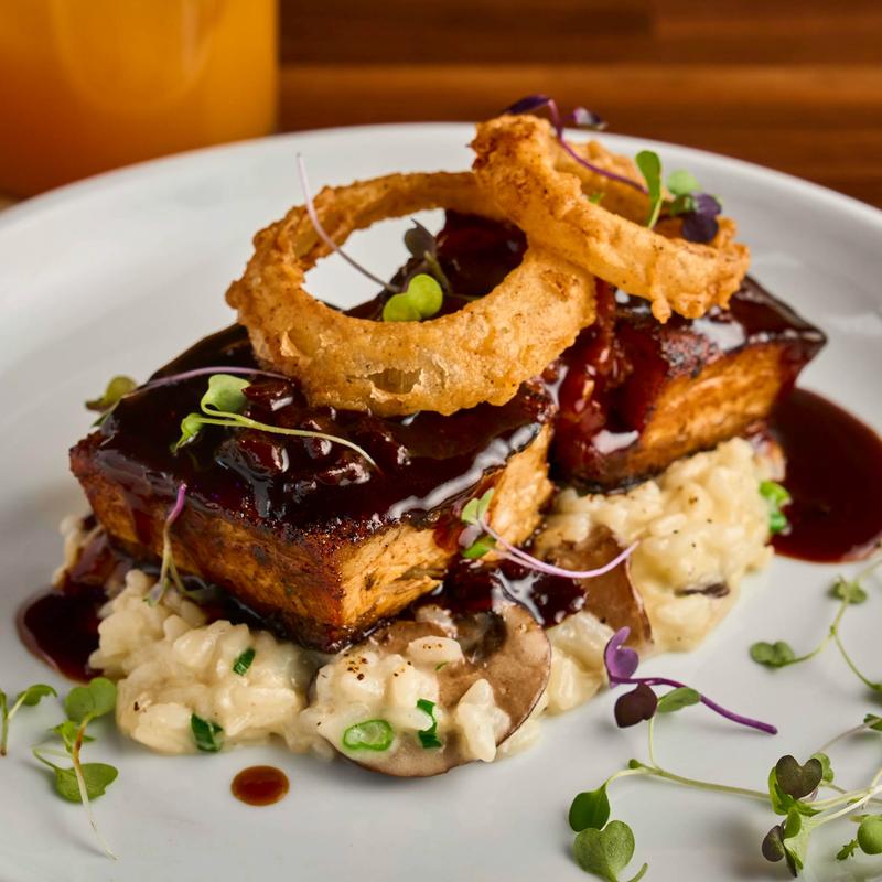 Wild mushroom risotto, tomato jam, crispy onion rings, and dried cherry port wine pork jus.
