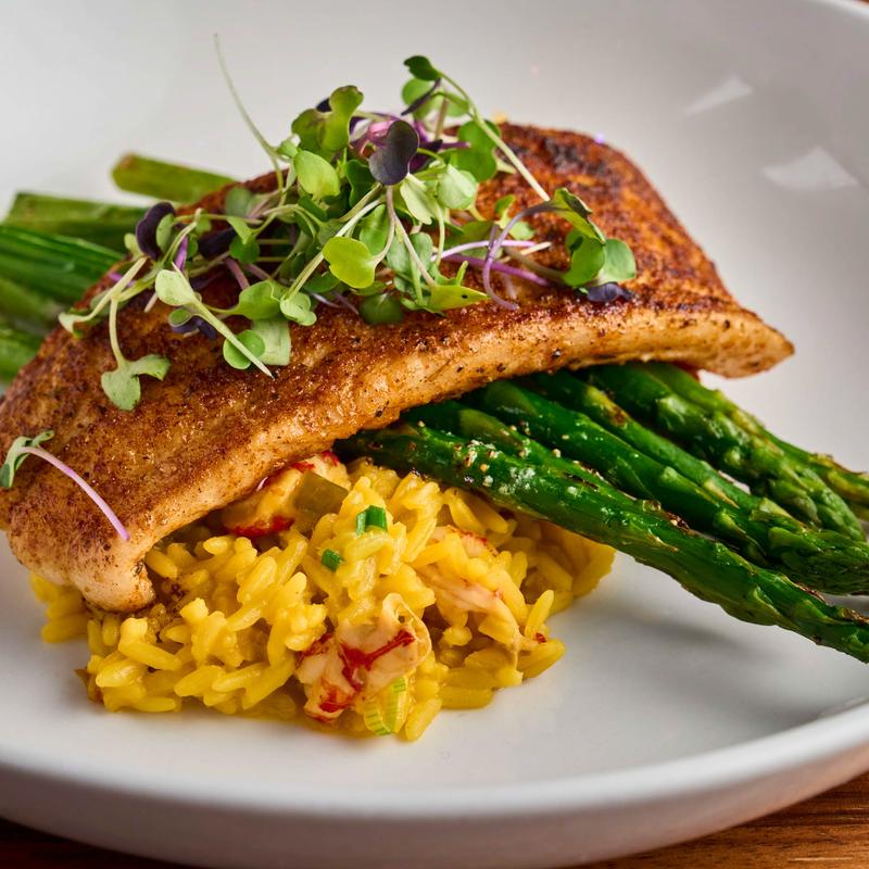 Yellow Saffron Spanish Rice with Crawfish, Grilled Asparagus, Lemon Beurre Blanc